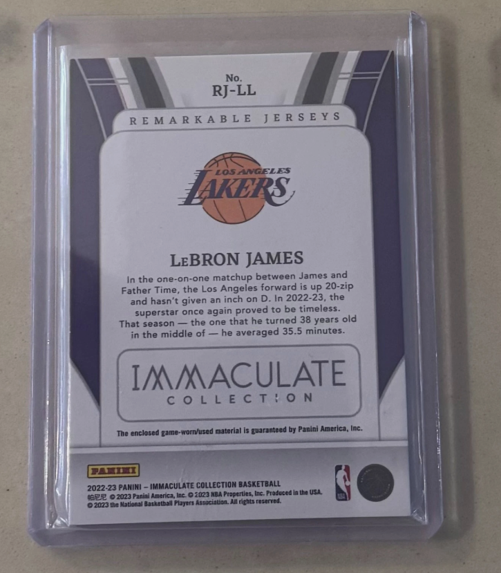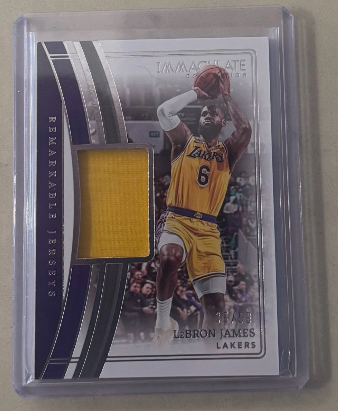 A must-have for NBA collectors, this 2022-23 Panini Immaculate Collection LeBron James Remarkable Jerseys #RJ-LL, numbered /99, features an authentic game-used jersey patch from one of basketball’s greatest players. Combining limited-edition scarcity with LeBron’s superstar legacy, this high-end card is perfect for display, investment, or as a centerpiece in any elite basketball card collection. Its premium design and low print run make it a standout collectible for fans and serious collectors alike.
